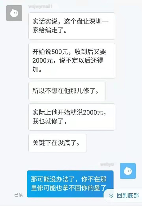 客戶就將硬盤寄到這家深圳店鋪去了。深圳店鋪收到客戶的硬盤后,馬上就重新給出了2000元的報價,而且需要私下付款,不走淘寶平臺交易。而且2000元還不是最終報價,恢復完后還要根據情況加錢。