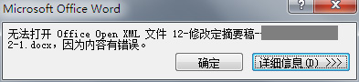 故障情況:客戶用Word寫的論文,因未知原因損壞,無法打開。提示:“無法打開 Office Open XML 文件 ......,因為內容有錯誤”